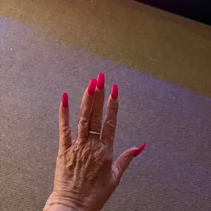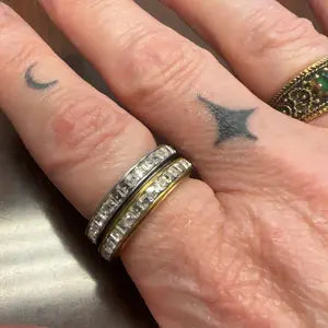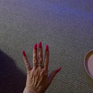 "Adore my old lady hands 🥰. Love this ring! I bought it in two sizes. This is the one that fits my ring finger. I enjoy the sensation and calming effect it’s offers. It’s a bit harder to twist it on my ring finger so I often wear the larger one that’s on my point finger more. It fits well though and isn’t too tight."